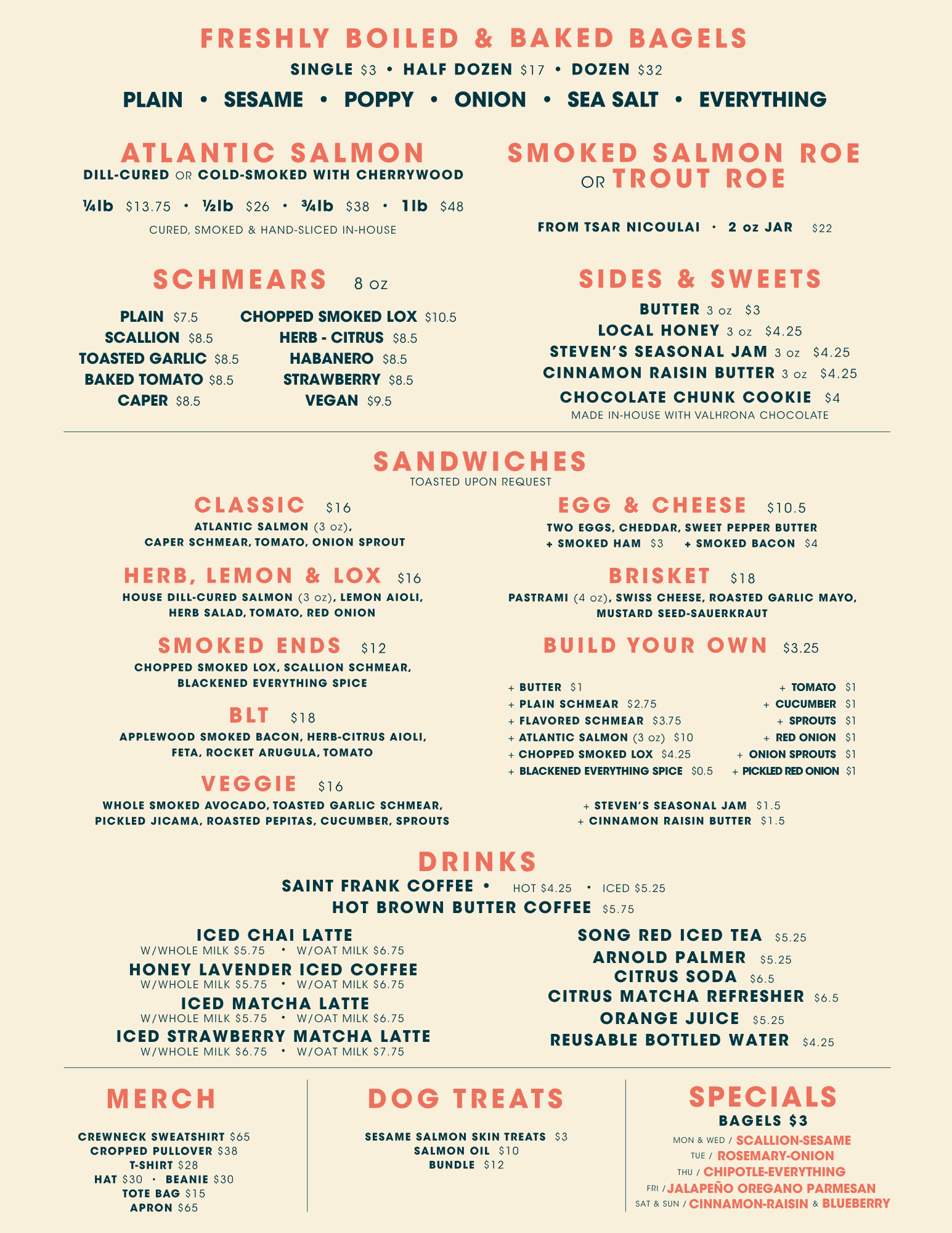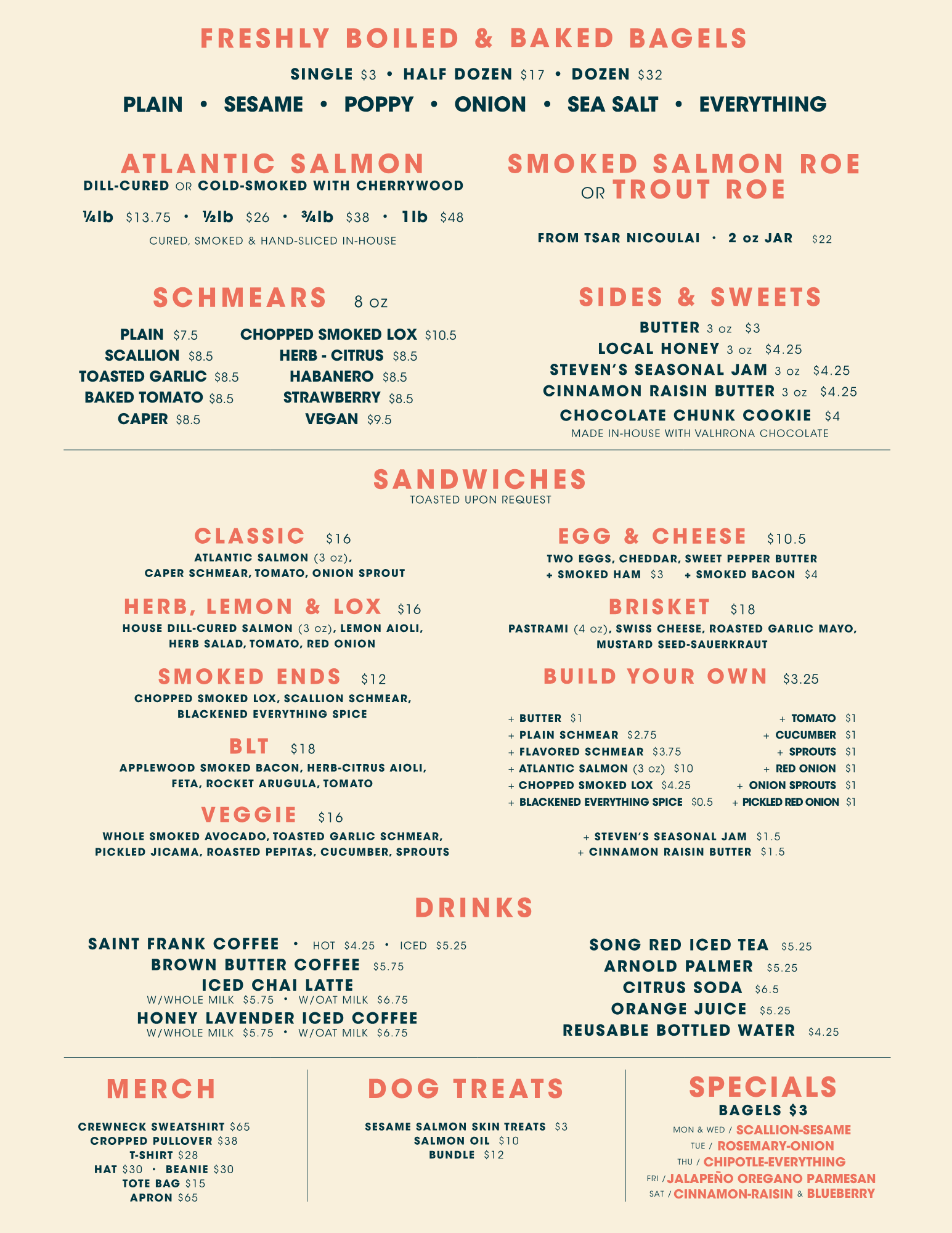 We open at 7:30am every day and accept orders until 1:45pm (or sold out). Pre-ordering goes live at 2pm for next-day orders (currently at NoPa location only; FiDi pre-ordering coming soon). The rest of our bagels are available for walk-up orders. Individual hot coffee is only available for online pre-order on weekdays at this time (bulk is available for next-day pre-order).